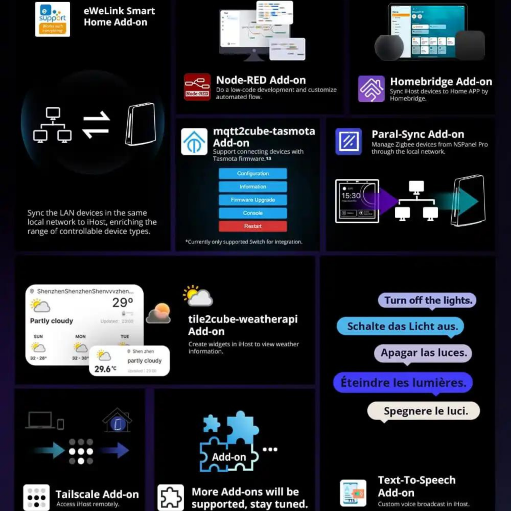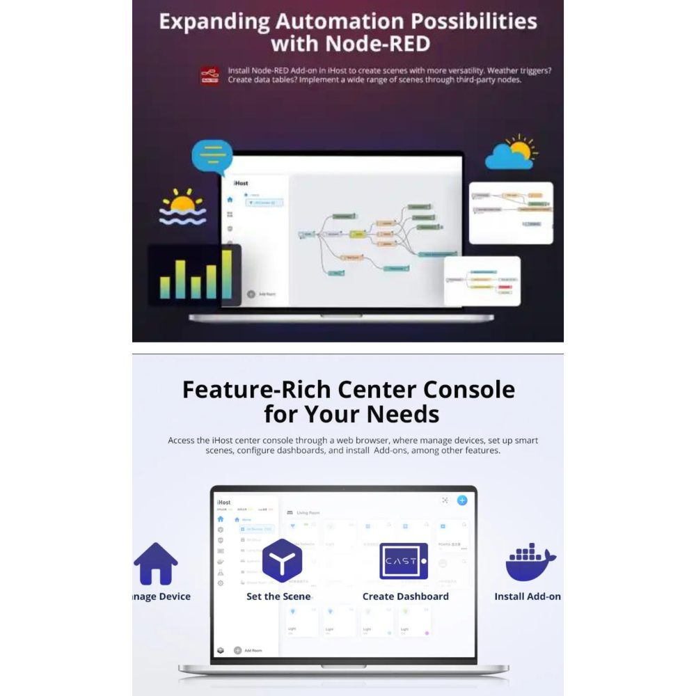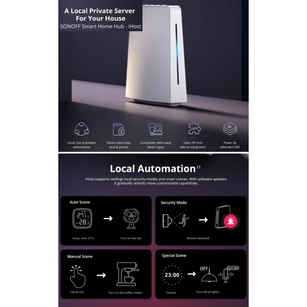 【الأتمتة المحلية】 يدعم iHost إعدادات أوضاع الأمان المحلية والمشاهد الذكية. مع تحديثات البرامج، فإنه يفتح تدريجيا المزيد من القدرات القابلة للتخصيص.