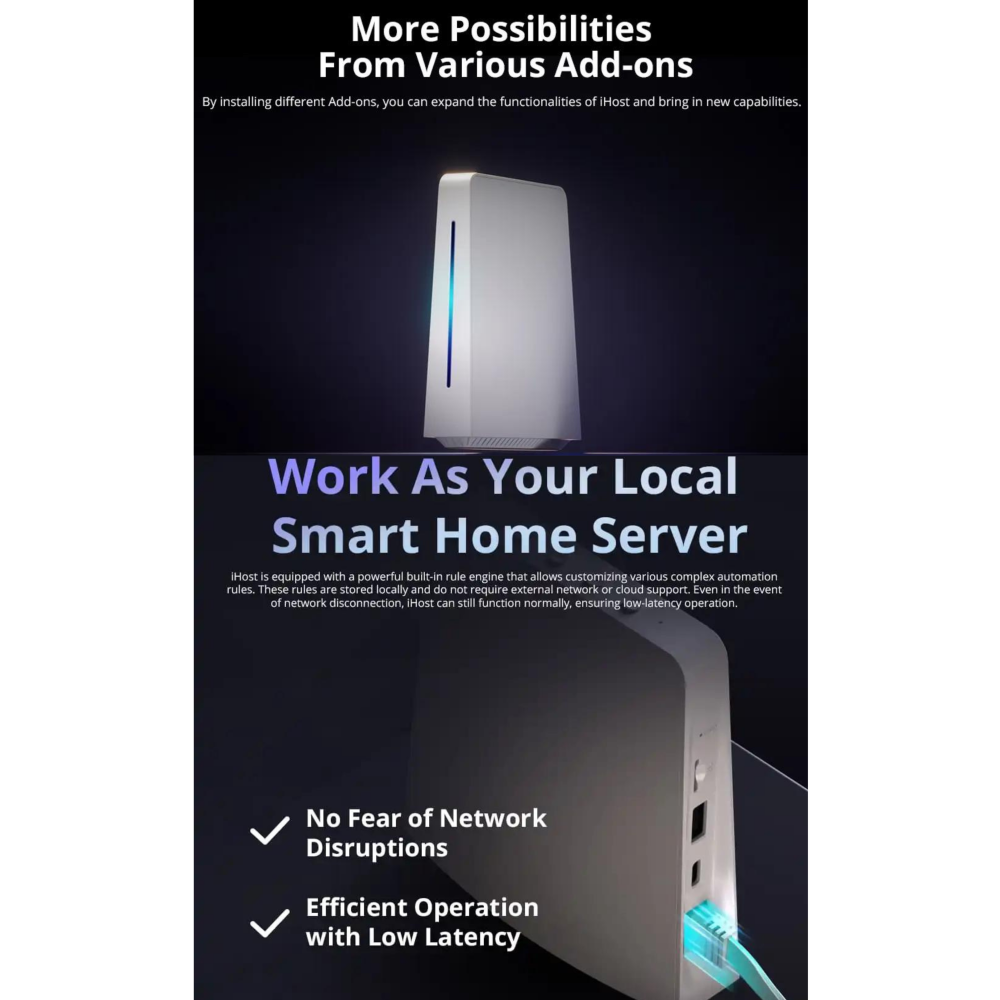【مركز التحكم المحلي】 يعمل مركز المنزل الذكي iHost كمركز تحكم محلي، مما يرفع تجربة التشغيل الآلي للمنزل لتكون أسرع وأكثر موثوقية وأكثر أمانا.