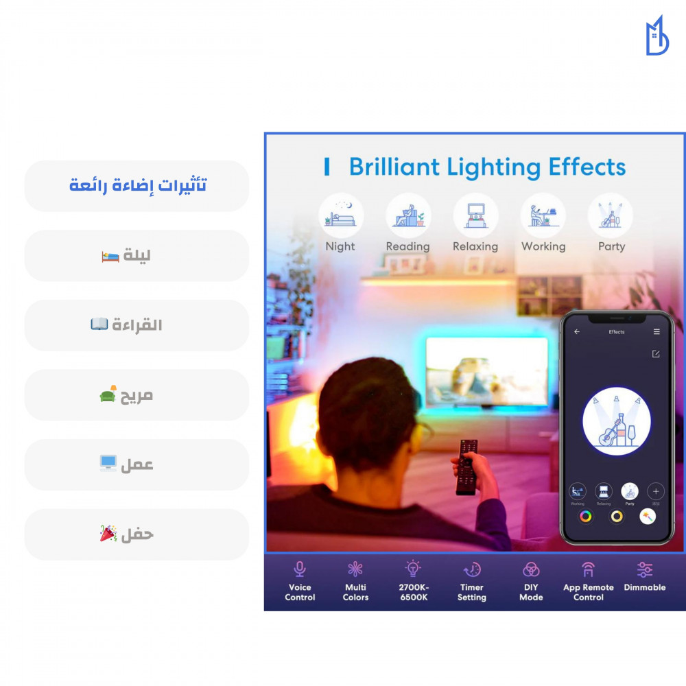 • يُمكنك ضبط السطوع والضوء والتحكم بألوان مختلفة بالإضافة الى تغيير درجة حرارة اللون.