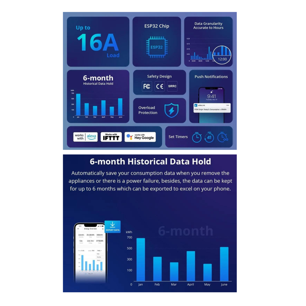 【6-Month Consumption History Data by Hour】 Power consumption data (accurate to hours) can be kept for up to 6 months which can be exported to excel on your phone.