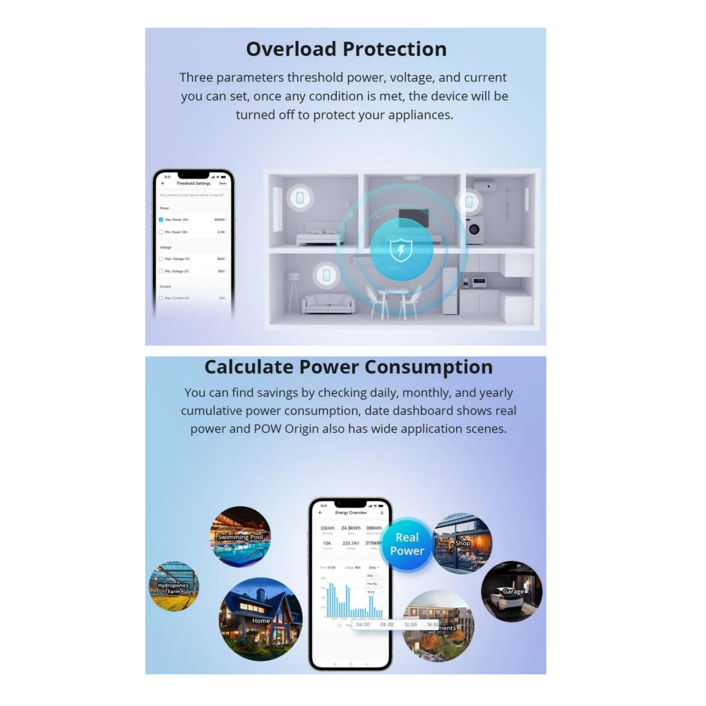 【Overload Protection】You can set power, current, and voltage threshold. Once any condition is met, the POW Origin will be turned off to protect your appliances.